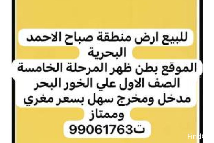 للبيع ارض منطقة صباح الاحمد البحرية الموقع بطن ظهر المرحلة الخامسه صف اول علي البحر مباشره