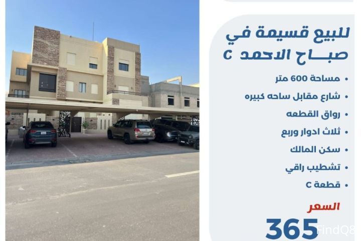 للبيع قسيمة في صباح الاحمد c مساحة 600 متر شارع مقابل ساحة كبيرة رواق المنطقه ثلاث ادوار وربع سكن المالك تشطيب راقي السعر 365 الف
