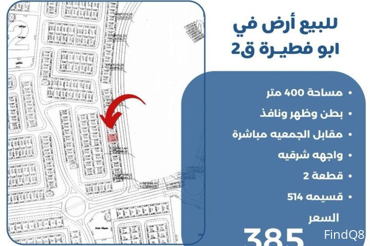 للبيع ارض في ابو فطيرة مساحة 400 متر بطن وظهر ونافذ مقابل الجمعية مباشرة واجهه شرقية قطعة 2قسيمة 514 السعر 385 الف