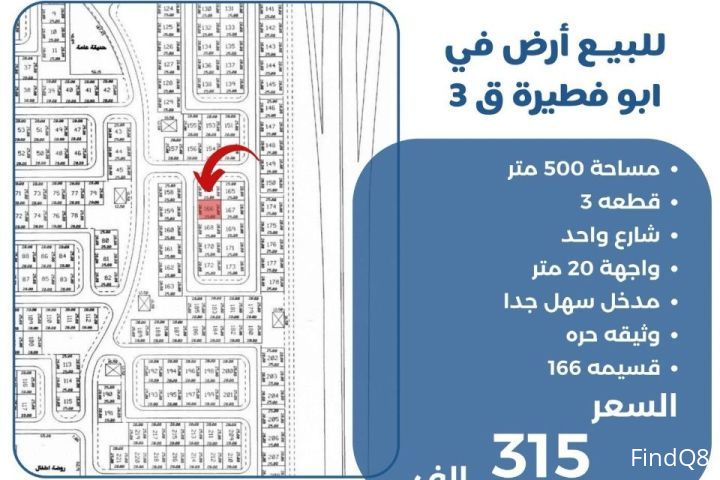 للبيع ارض في ابو فطيره قطعه 3 مساحة 500 متر شارع واحد واجهه 20 متر مدخل سهل جدا وثيقه حره قسيمة 166 السعر 315 الف