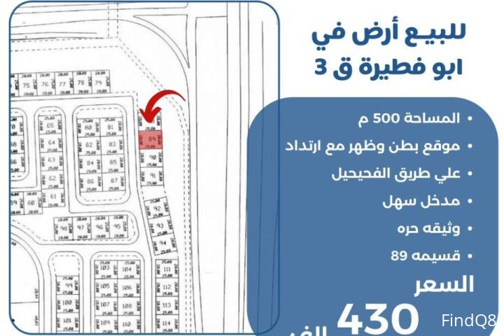 للبيع ارض في ابو فطيره قطعه 3 المساحة 500 متر موقع بطن وظهر مع ارتداد على طريق الفحيحيل مدخل سهل وثيقه حره قسيمة 89 السعر 430 الف