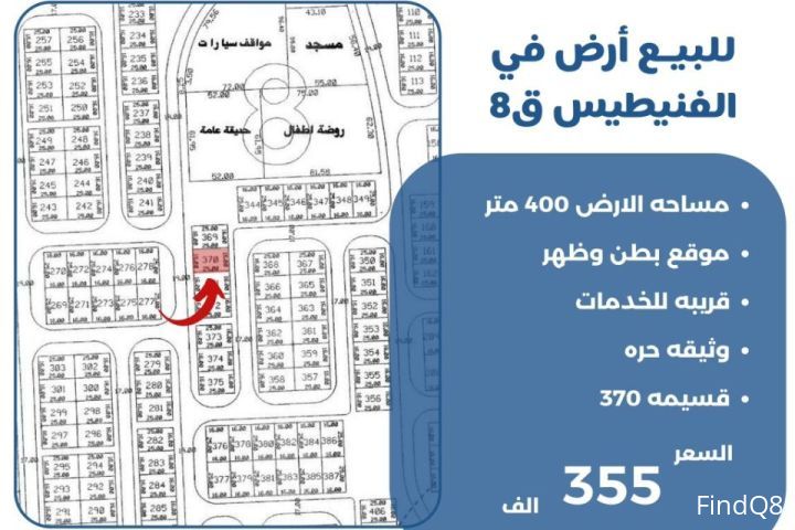 للبيع ارض في الفنيطيس قطعه 8 مساحة الارض 400 متر موقع بطن وظهر قريبه للخدمات وثيقه حره قسيمة 370 السعر 355 الف