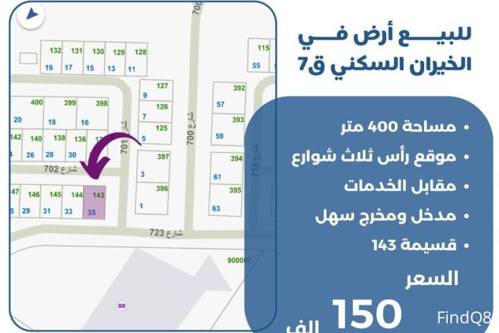 للبيع ارض في الخيران السكني قطعة 7 موقع رأس ثلاث شوارع مقابل الخدمات مدخل ومخرج سهل قسيمة 143 السعر 150 الف