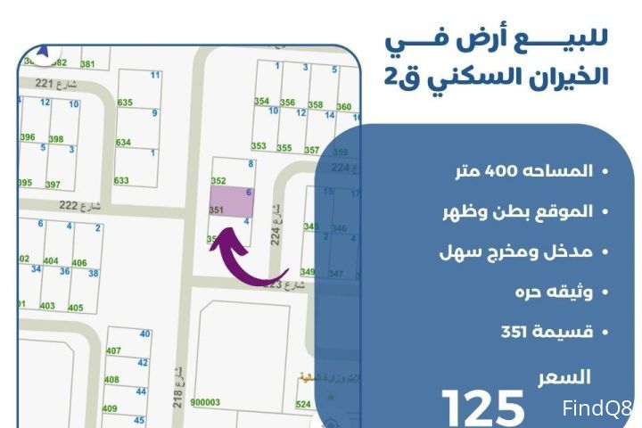 للبيع ارض في الخيران السكني قطعه2 المساحة 400 متر الموقع بطن وظهر مدخل ومخرج سهل وثيقه حره قسيمة 351 السعر 125 الف