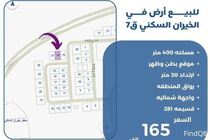 للبيع ارض في الخيران السكني قطعة 7 مساحة 400 متر موقع بطن وظهر ارتداد 30 متر رواق المنطقة واجهه شمالية قسيمة 281 السعر 165 الف