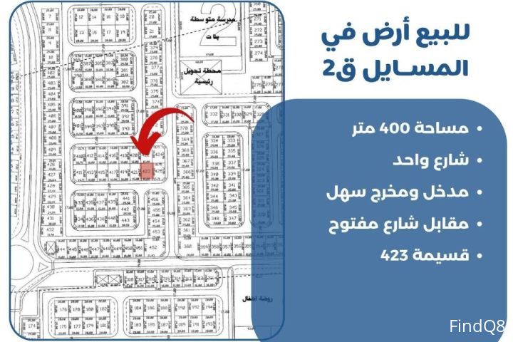 للبيع ارض في المسايل قطعة 2 المساحة 400متر شارع واحد مدخل ومخرج سهل مقابل شارع مفتوح قسيمة 423