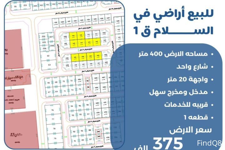 للبيع ارض في السلام قطعه 1 مساحة الارض 400 متر شارع واحد واجهه 20 متر مدخل ومخرج سهل قريبه للخدمات سعر الارض 375 الف