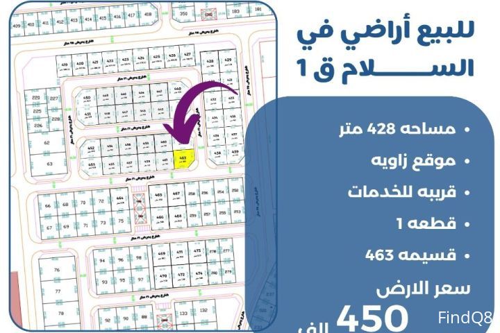 للبيع ارض في السلام قطعه 1 مساحة 428 متر موقع زاوية قرب للخدمات قسيمة 463 سعر الارض 450 الف