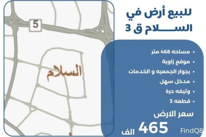 للبيع ارض في السلام قطعة 3 مساحة 468 متر موقع زاوية بجوار الجمعية والخدمات مدخل سهل وثيقة حره سعر الارض 465 الف