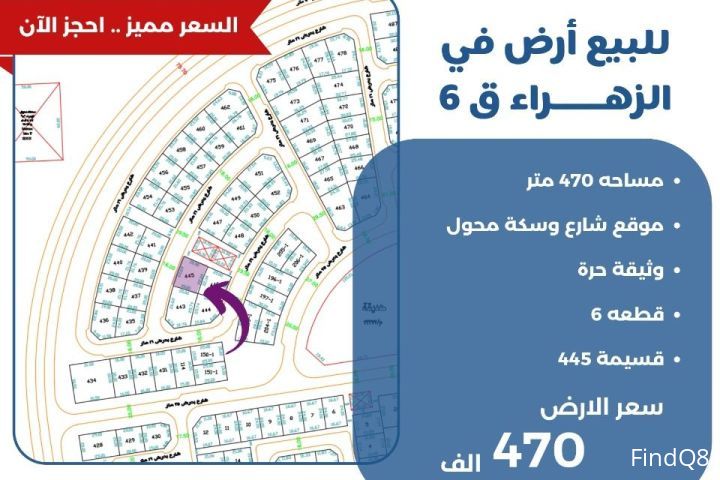 للبيع ارض في الزهراء ق6 مساحة 470 متر موقع شارع وسكة محول وثيقه حره قسيمة 445 سعر الارض 470 الف