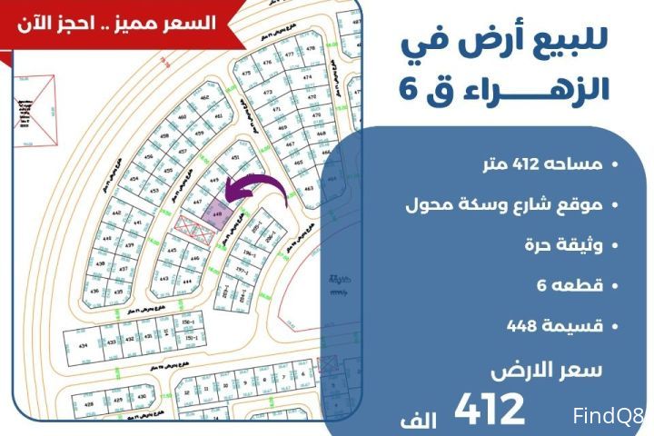 للبيع ارض في الزهراء ق6 مساحة 412 متر موقع شارع وسكة محول وثيقه حره قسيمة 448 سعر الارض 412 الف