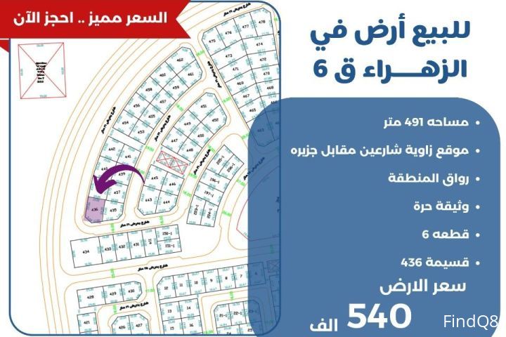 للبيع ارض في الزهراء قطعه6 مساحة 491 متر موقع زاوية شارعين مقابل جزيرة رواق المنطقه وثيقه حره قسيمة 436 سعر الارض 540 الف
