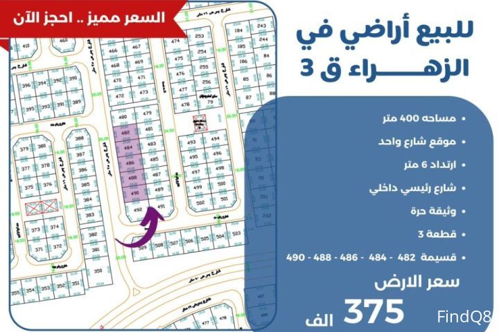 للبيع ارض في الزهراء قطعه 3 مساحة 400 متر موقع شارع واحد ارتداد 6 متر شارع رئيسي داخلي وثيقه حره قسيمة 488 سعر الارض 375 الف