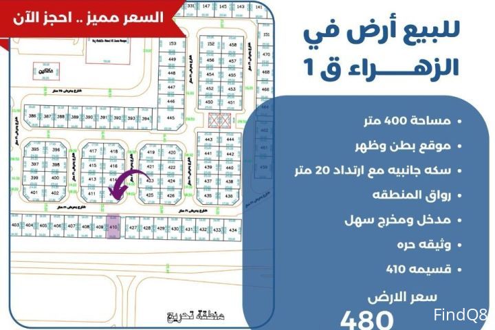 للبيع ارض في الزهراء قطعة 1 مساحة 400متر موقع بطن وظهر سكه جانبية مع ارتداد 20 متر رواق المنطقه مدخل ومخرج سهل وثيقه حره قسيمة 410 سعر الارض 480 الف