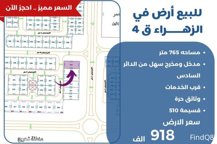 للبيع ارض في الزهراء قطعه 4 مساحة 765 متر مساحة 465 متر مدخل ومخرج سهل من الدائر السادس قرب الخدمات وثائق حره قسيمة 510 سعر الارض 918 الف