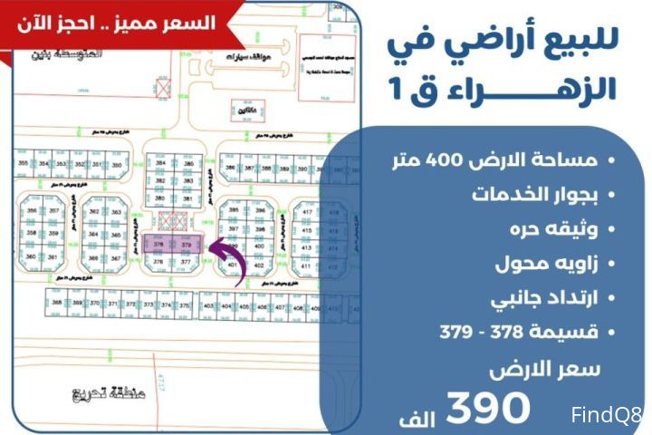 للبيع ارض في الزهراء قطعه 1 مساحه 400 متر بجوار الخدمات وثيقه حره زاويه محول مع ارتداد جانبي السعر الارض 390 الف