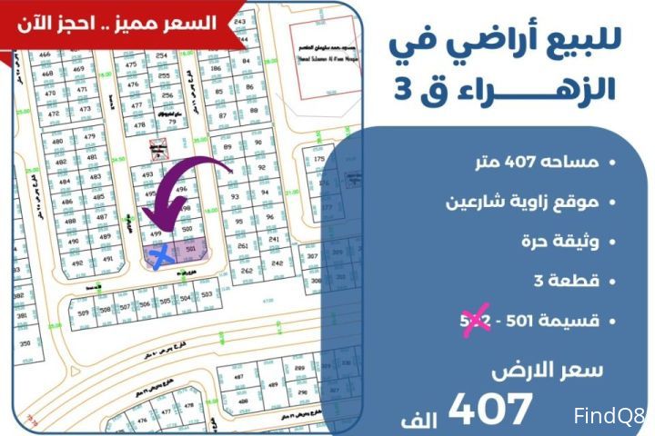 للبيع ارض في الزهراء قطعه 3 مساحة 407 متر موقع زاوية شارعين وثيقه حره قسيمة 501 سعر الارض 407 الف