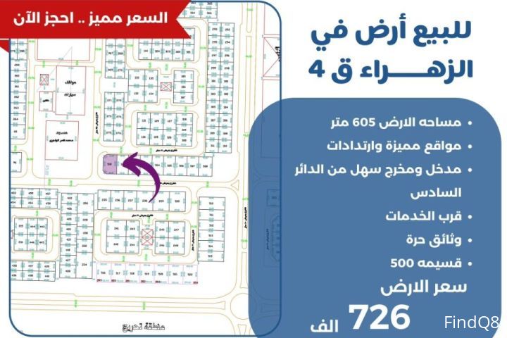 للبيع ارض في الزهراء قطعه 4 مساحة الارض 605 متر مواقع مميزه وارتدادات مدخل ومخرج سهل من الدائر السادس قرب الخدمات وثائق حره قسيمة 500 سعر الارض 726 الف
