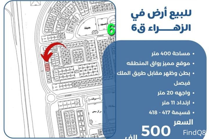 للبيع ارض في الزهراء قطعة 6 مساحة 400 متر موقع مميز رواق المنطقه بطن وظهر مقابل طريق الملك فيصل واجهه 20 متر ارتداد 11 متر قسيمة 417- 418 السعر 500 الف
