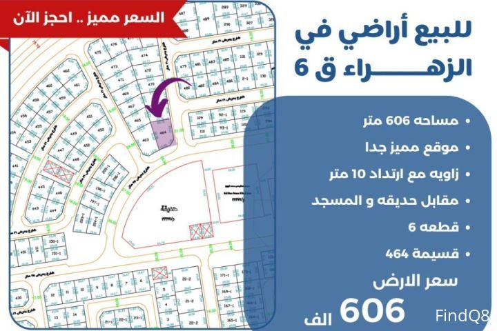 للبيع ارض في الزهراء قطعة 6 مساحة 606 متر موقع مميز جدا زاوية مع ارتداد 10 متر مقابل حديقه والمسجد قسيمة 464 سعر الارض 606 الف