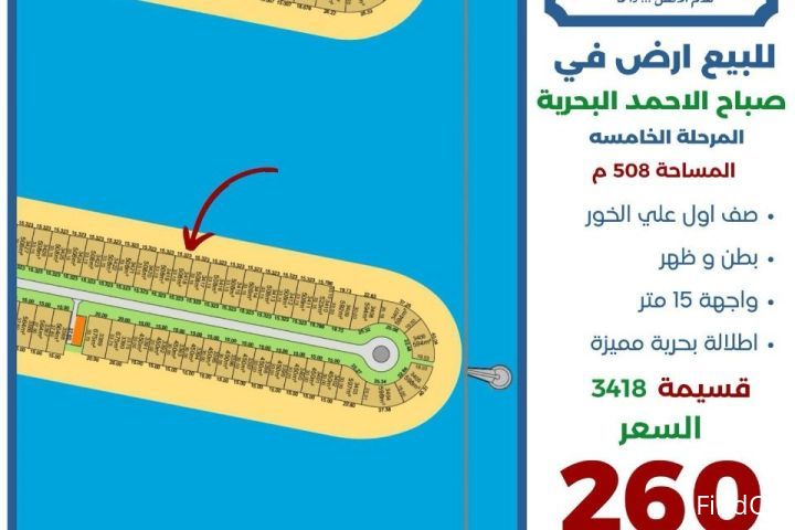 للبيع ارض في صباح الاحمد البحرية المرحلة الخامسة المساحة 508 متر صف اول على الخور بطن وظهر واجهه 15 متر