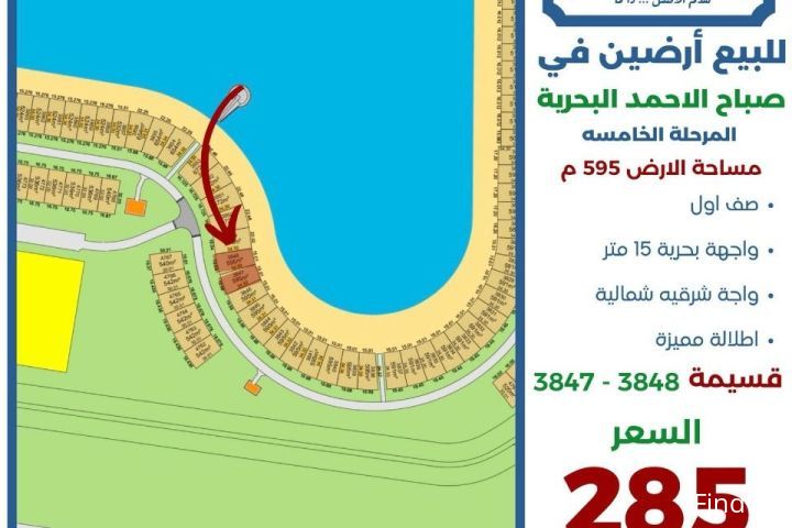 للبيع ارضين في صباح الاحمد البحرية المرحلة الخامسة مساحة الارض 595 متر صف اول واجهه بحرية 15 متر واجهه شرقية شمالية اطلالة مميزة سعر الارض 285 الف