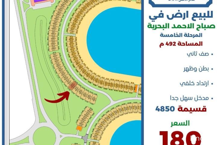 للبيع ارض في صباح الاحمد البحرية المرحلة الخامسه المساحة 492متر صق ثاني بطن وظهر ارتداد خلفي مدخل سهل جدا قسيمه 4850 السعر 180 الف