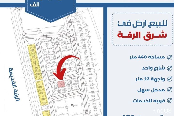 للبيع ارض في شرق الرقه مساحة 440 متر شارع واحد واجهه 22متر مدخل سهل قريبه للخدمات السعر 310 الف