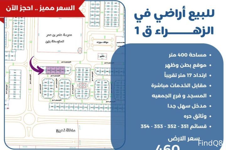 للبيع بلوك 4 اراضي في الزهراء قطعه 1 مساحة 400 متر موقع بطن وظهر مع ارتداد 17 متر تقريبا مقابل الخدمات مباشرة المسجد و فرع الجمعيه مدخل سهل جدا وثايق حره قسائم 354 × 353 × 352 × 351 السعر الارض 460 الف