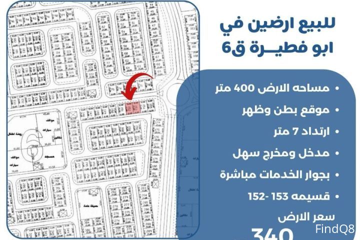 للبيع ارضين في ابو فطيرة قطعة 6 مساحة الارض 400 متر موقع بطن وظهر ارتداد 7 متر مدخل ومخرج سهل بجوار الخدمات مباشرة سعر الارض 340 الف