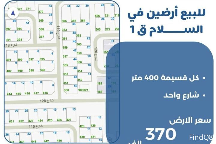 للبيع ارضين في منطقة السلام قطعة 1 كل قسيمة 400 متر شارع واحد السعر الارض 370 الف