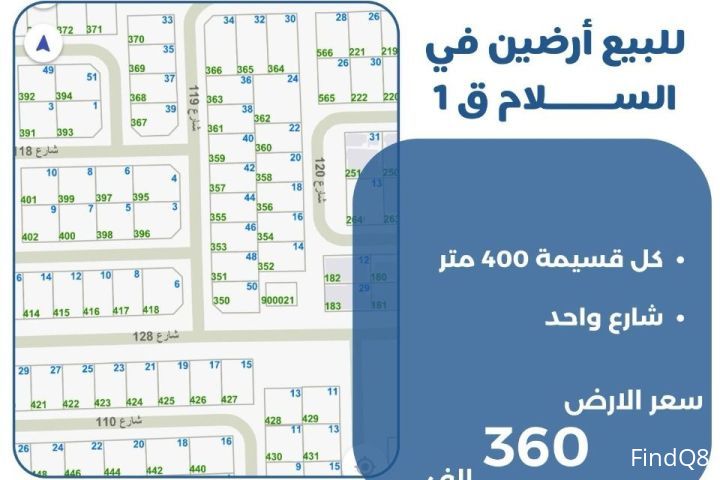 للبيع ارضين في منطقة السلام قطعة 1 كل قسيمة 400 متر شارع واحد السعر الارض 360 الف