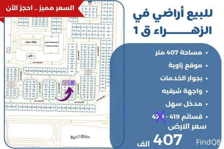 للبيع ارضين في الزهراء قطعه 1 مساحه 407 متر موقع زاويه بجوار الخدمات واجها شرقيه مدخل سهل قسائم × 419 السعر الارض 407 الف