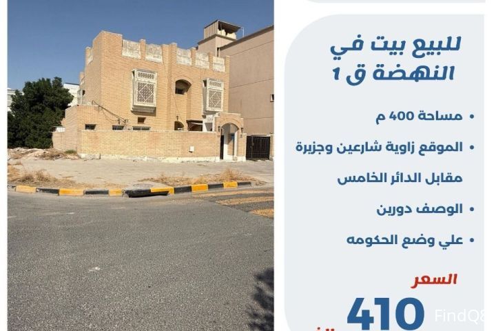 للبيع بيت في النهضه قطعة 1 مساحة 400 متر الموقع زاوية شارعين وجزيرة مقابل الدائر الخامس الوصف دورين على وضع الحكومه السعر 410 الف
