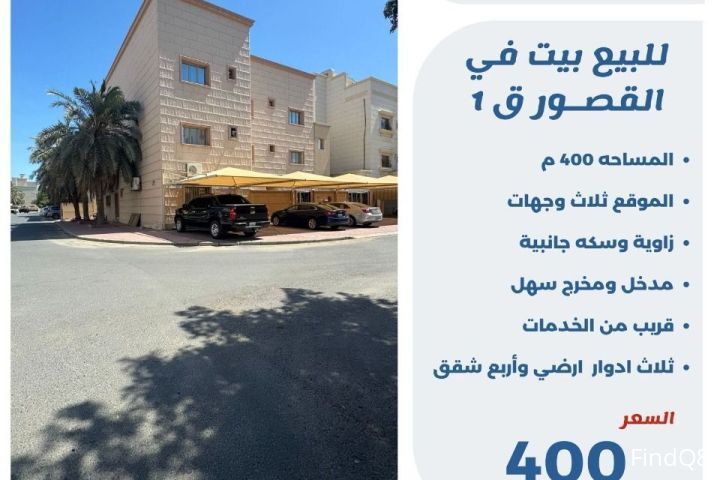 للبيع بيت في القصور قطعة 1 المساحة 400 متر الموقع ثلاث وجهات زاوية وسكة جانبية مدخل ومخرج سهل قريبه من الخدمات ثلاث ادوار ارضي واربع شقق السعر 400 الف