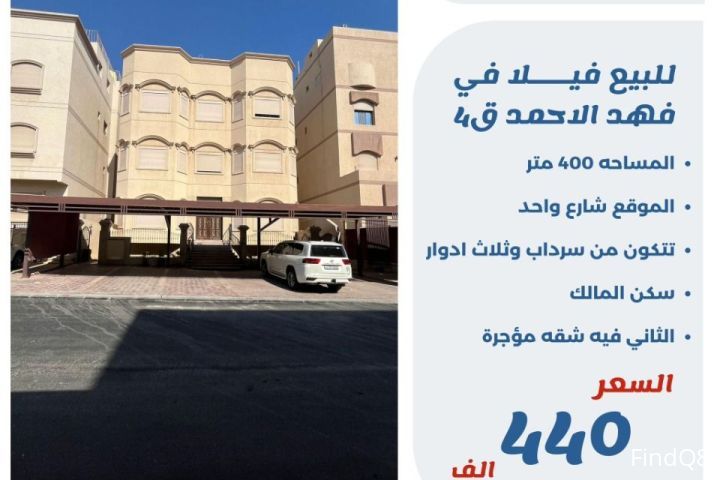 للبيع فيلا في فهد الاحمد قطعة 4 المساحة 400 متر الموقع شارع واحد تتكون من سرداب وثلاث ادوار سكن المالك الثاني فيه شقه مؤجره السعر 440 الف