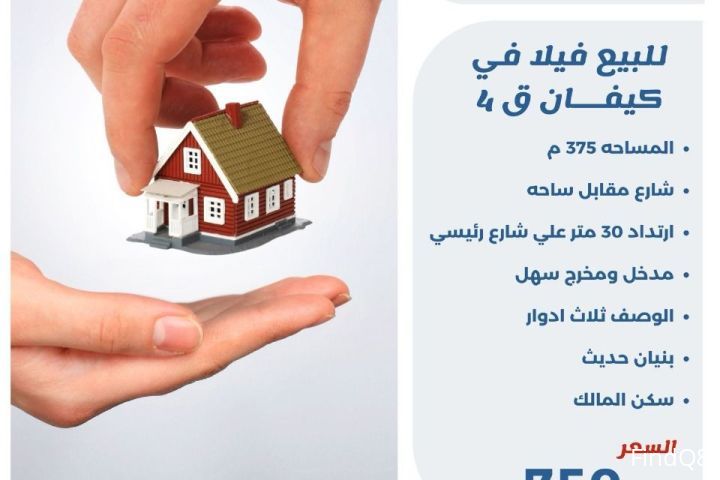 للبيع فيلا في كيفان قطعة 4 المساحه 375متر شارع مقابل ساحه ارتداد 30 متر على شارع رئيسي مدخل ومخرج سهل الوصف ثلاث ادوار بنيان حديث سكن المالك السعر 750 الف