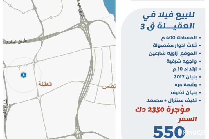 للبيع فيلا في العقيلة قطعة3 المساحة 400 متر ثلاث ادوار مفصوله الموقع زاوية شارعين واجهه شرقيه ارتداد 10 متر بنيان 2017 وثيقة حره بنيان نضيف تكييف سنترال + مصعد مؤجرة 2350 دك السعر 550 الف