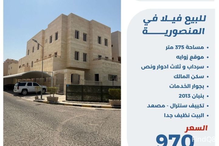 للبيع فيلا في المنصوريه زوايه مساحه 375 متر سرداب و ثلاث ادوار ونص سكن المالك بجوار الخدمات بنيان 2013 تكييف سنترال مصعد البيت نظيف جدا السعر 970 الف دينار