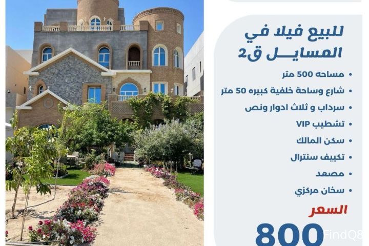 للبيع فيلا في المسايل قطعة 2 مساحة 500 متر شارع وساحة خلفية كبيرة 50 متر سرداب وثلاثة ادوار ونص تشطيب VIP سكن المالك مصعد سخان مركزي تكييف سنترال السعر 800 الف