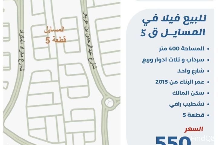 للبيع فيلا في المسايل قطعه 5 سرداب و ثلاث ادوار وربع المساحة 400 شارع واحد السعر 550 الف