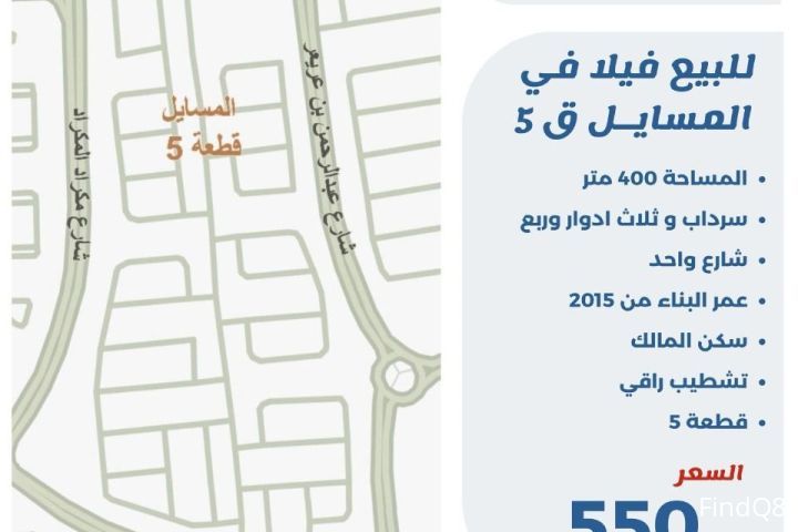 للبيع فيلا في المسايل قطعه 5 سرداب و ثلاث ادوار وربع المساحة 400 شارع واحد تشطيب راقي سكن المالك السعر 550 الف