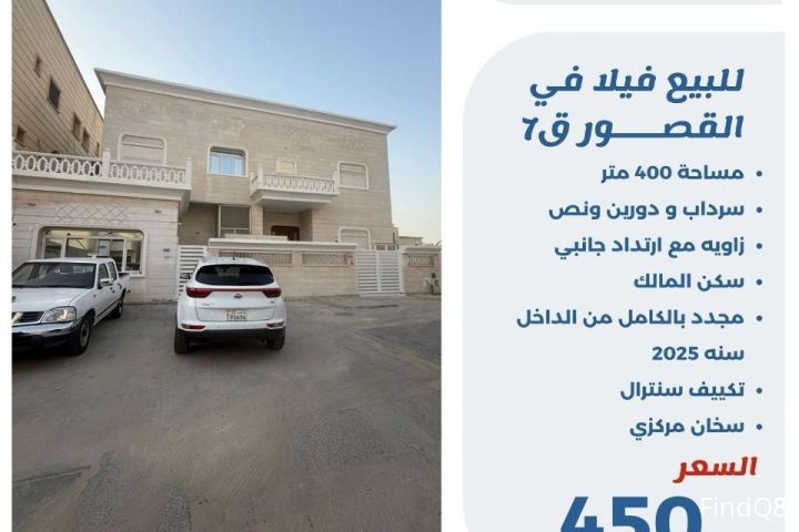 للبيع فيلا في القصور قطعة 7 مساحة 400 متر سرداب ودورين ونص زاوية مع ارتداد جانبي سكن المالك مجدد بالكامل من الداخل سنه 2025 تكييف سنترال سخان مركزي السعر 450 الف