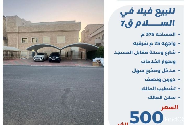 للبيع فيلا في السلام قطعة 7 المساحة 375 متر واجهه 25 متر شرقيه شارع وسكه مقابل المسجد وبجوار الخدمات مدخل ومخرج سهل دورين ونصف تشطيب المالك سكن المالك السعر 500 الف