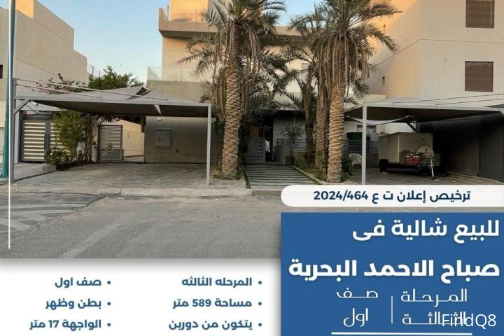 للبيع شالية في صباح الاحمد البحرية المرحلة الثالثة صف اول المرحلة الثالثة مساحة 589 متر يتكون من دورين بطن وظهر الواجهه 17 متر السعر 410 الف
