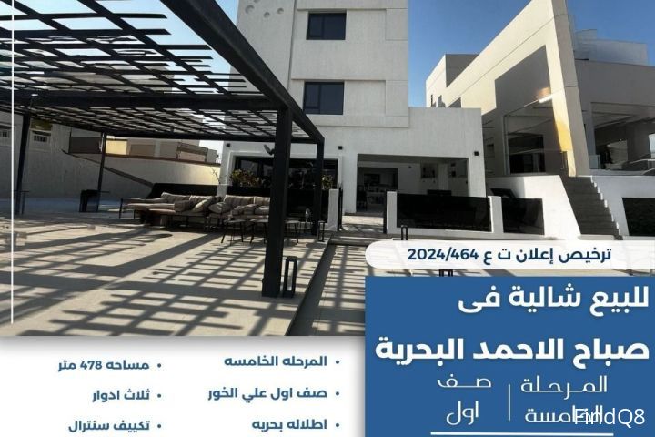 للبيع شاليه في صباح الاحمد البحريه المرحله الخامسه صف اول علي الخور اطلاله بحريه ثلاث ادوار مساحه 478 متر تكييف سنترال مصعد شتر السعر 490 الف