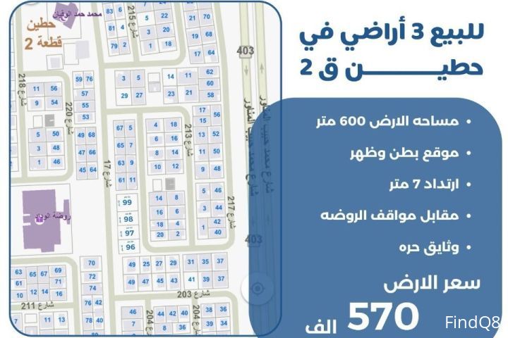 للبيع 3 اراضي في حطين ق2 مساحة الارض 600 متر موقع بطن وظهر ارتداد 7 متر مقابل مواقف الروضه وثايق حره سعر الارض 570 الف