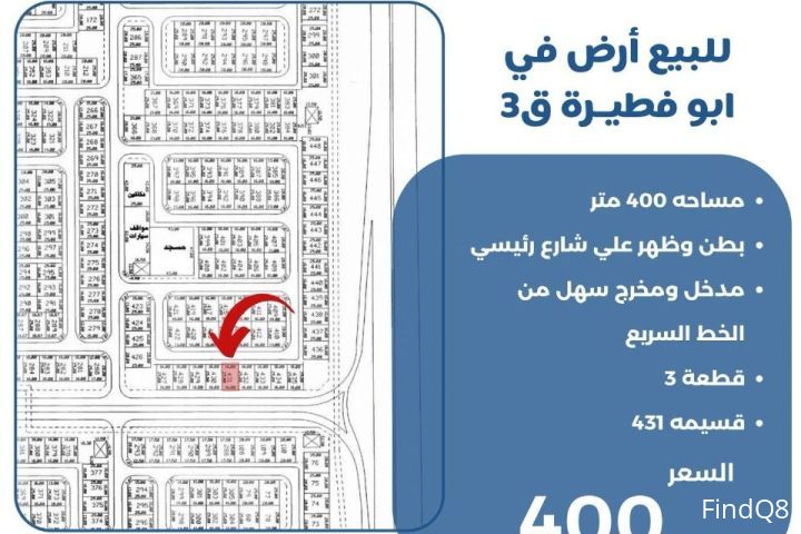 للبيع ارض في ابو فطيرة قطعة 3 مساحة 400 متر بطن وظهر على شارع رئيسي مدخل ومخرج سهل من الخط السريع قسيمة 431 السعر 400 الف