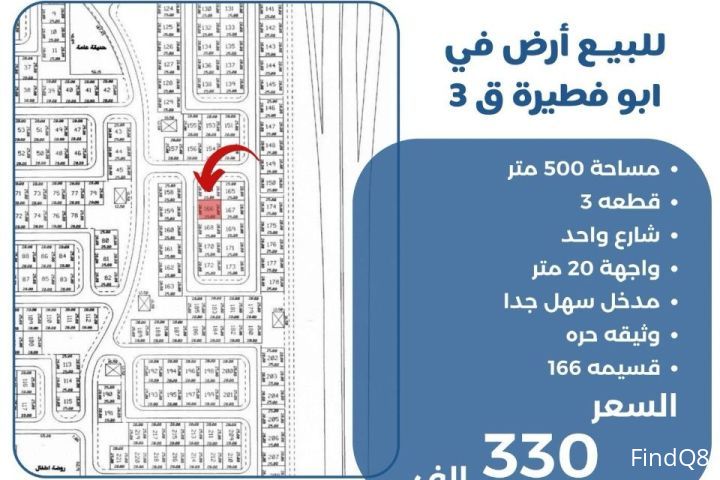 للبيع ارض في ابو فطيره قطعه 3 مساحة 500 متر شارع واحد واجهه 20 متر مدخل سهل جدا وثيقه حره قسيمة 166 السعر 330 الف