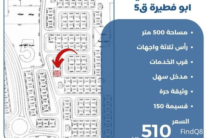 للبيع ارض في ابو فطيرة قطعة 5 مساحة 500 متر راس ثلاث واجهات قرب الخدمات مدخل سهل وثيقة حرة السعر 510 الف